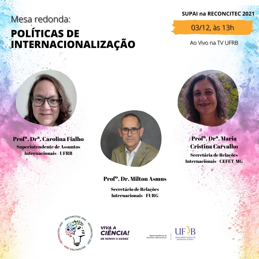 O Profº. Dr. Milton Lafourcade Asmus, secretário da Secretaria de Relações Internacionais (Reinter) da FURG, estará representando a instituição na Reunião Anual de Ciência, Tecnologia, Inovação e Cultura no Recôncavo da Bahia (RECONCITEC) 2021, cujo tema deste ano é “Viva a Ciência!”. A mesa redonda em que ele participará tratará de questões sobre Políticas de Internacionalização e será mediada pela Profª. Drª. Carolina Fialho Silva (SUPAI/UFRB).