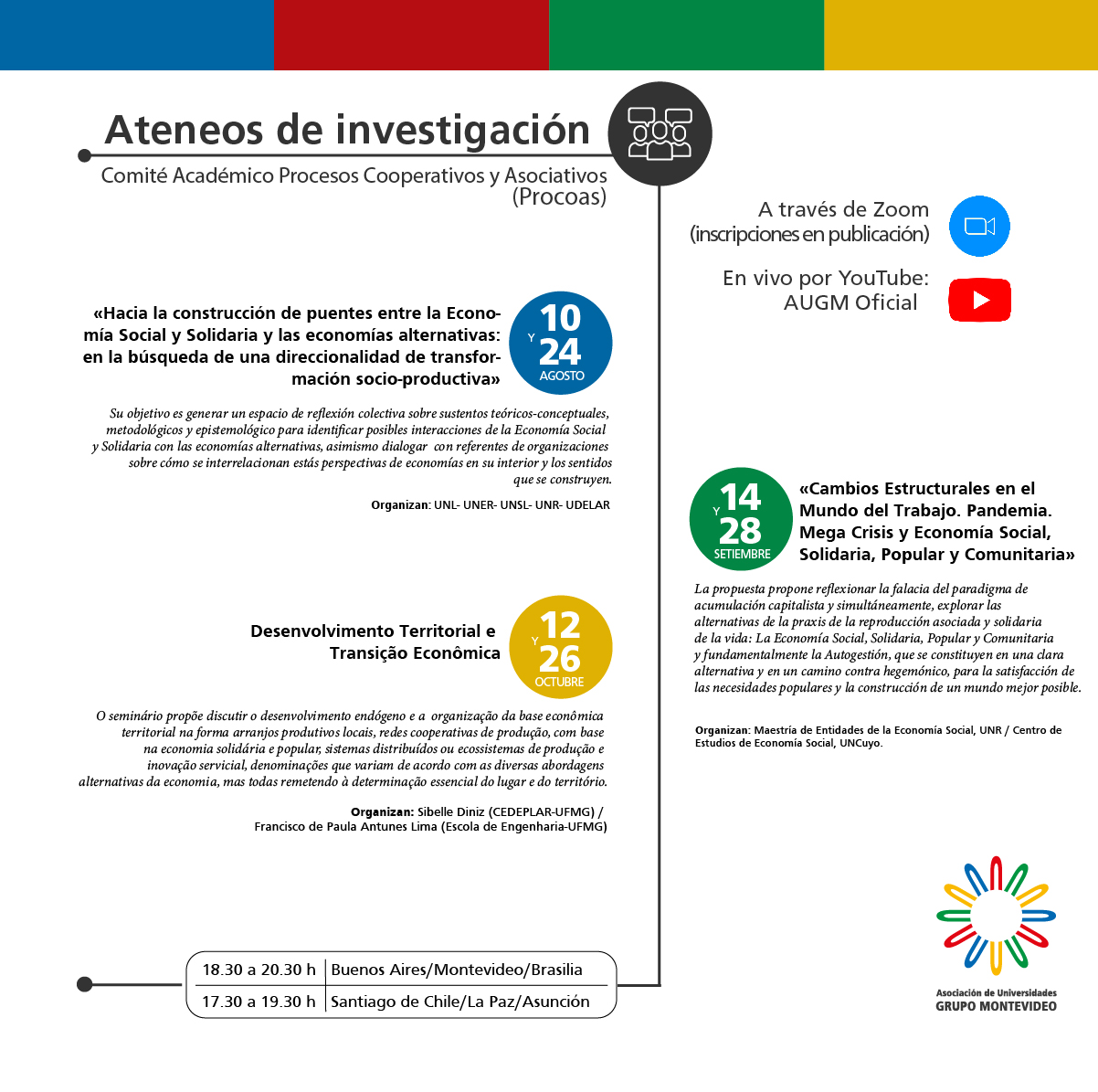 Depois do sucesso do ciclo 2020, o Comitê Acadêmico Processos Cooperativos e Associativos (Procoas) da Associação de Universidades do Grupo Montevidéu (AUGM) mais uma vez propõe um conjunto de atividades virtuais de âmbito regional, desta vez um ciclo de conferências de pesquisa.