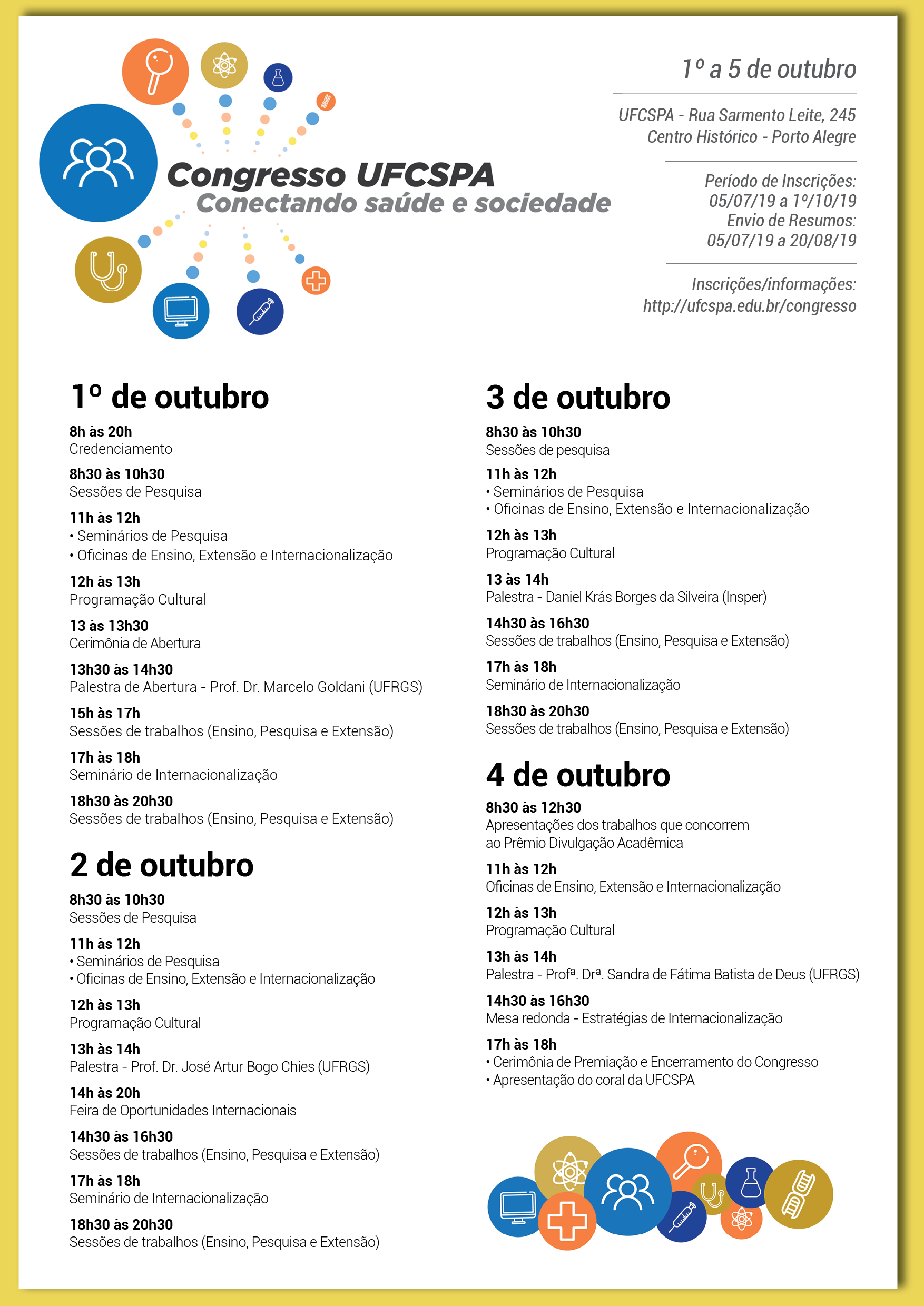 A Universidade Federal de Ciências da Saúde de Porto Alegre (UFCSPA) está promovendo um congresso que abrange o II Seminário de Internacionalização, a V Mostra de Trabalhos de Ensino, Pesquisa e Extensão, e o TEDxUFCSPA (2019): (Des)Conexões. O evento tem como tema “Conectando Saúde e Sociedade” e visa dar visibilidade aos trabalhos acadêmicos da instituição, além de aproximar a comunidade externa e promover a reflexão sobre o papel do ensino superior no contexto socioeconômico. As inscrições vão até 1º de outubro.