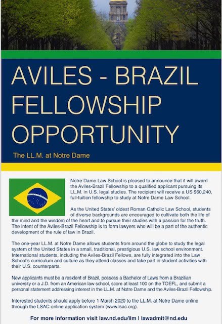 De acordo com a revista US News, a Notre Dame Law School está entre as 25 melhores instituições acadêmicas de Direito do mundo. Já, no LL.M. (Mestrado em Direito), os estudantes têm a oportunidade de expandir e aprofundar seus conhecimentos do sistema legal dos Estados Unidos e compreender a cultura americana à medida que entram no mercado legal global. Ademais, a bolsa Aviles-Brazil surgiu a partir da doação de um casal de ex-alunos da universidade, pois desejavam que mais brasileiros tivessem a oportunidade de estudar Direito na instituição.