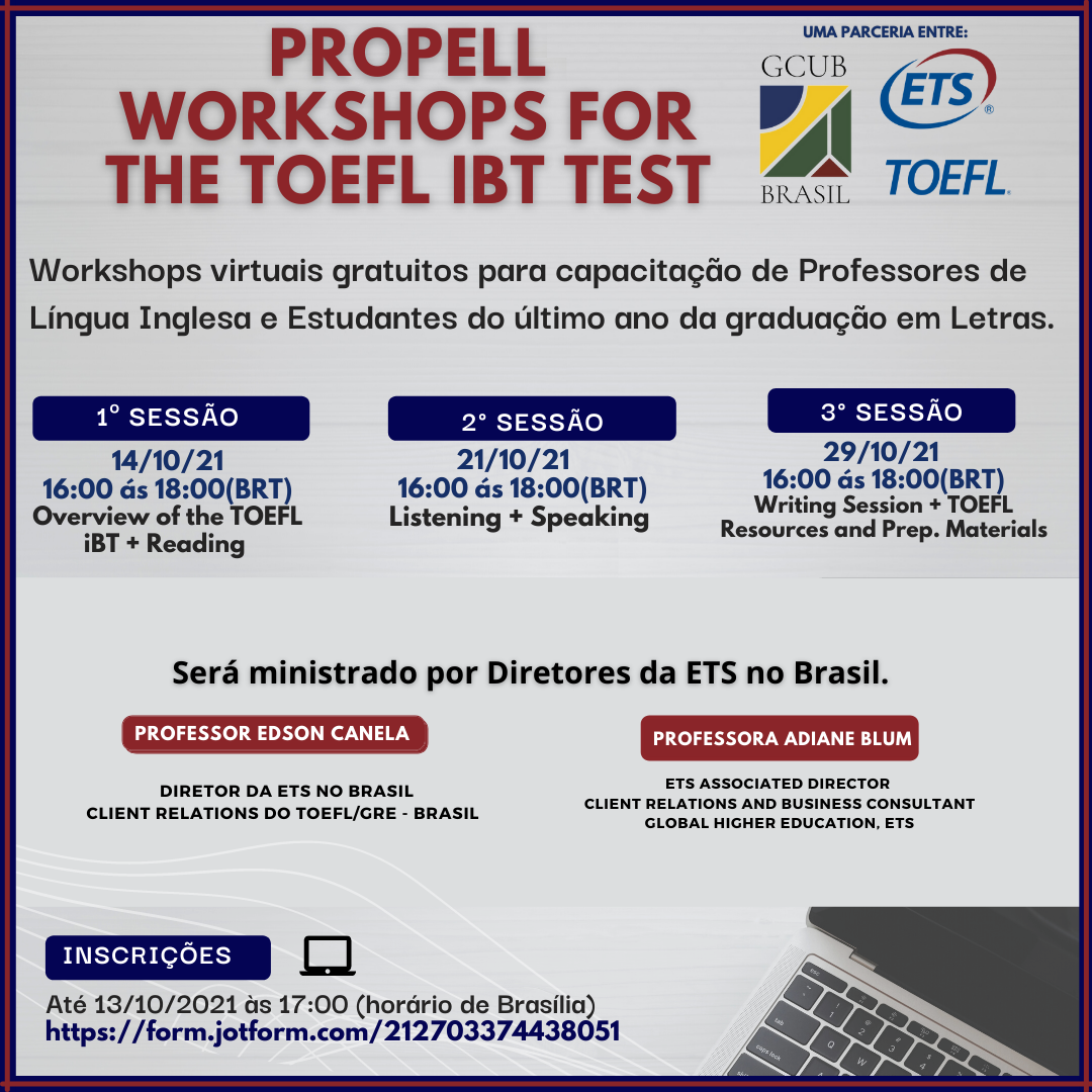 Os Workshops são frutos da parceria entre a Educational Testing Service - ETS, organização responsável pelos exames TOEFL iBT e GRE em todo o mundo, e o Grupo de Cooperação Internacional de Universidades Brasileiras - GCUB. As inscrições estão abertas até o dia 13 de outubro e os eventos ocorreram nos dias 14, 21 e 29 deste mês.