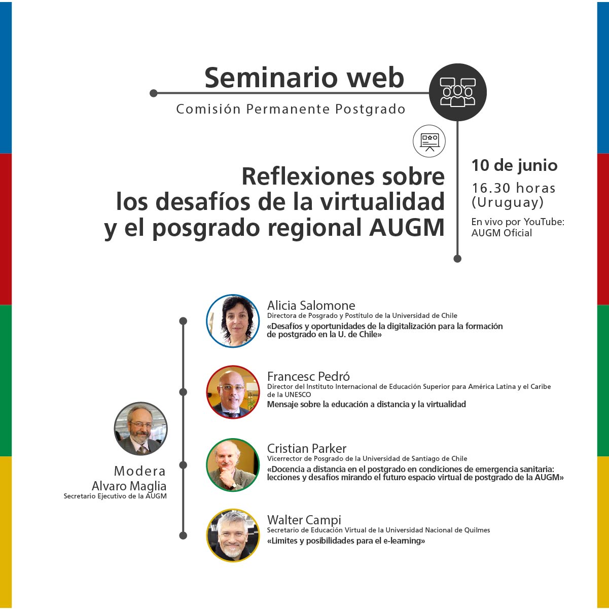 A transmissão on-line conta com a presença da Diretora de Pós-Graduacao da Universidade do Chile, Alicia Salomone, do Diretor do Instituto Internacional de Educação Superior da América Latina e Caribe, Francesc Pedró, do Vice-Reitor de Pós-Graduação da Universidade de Santiago do Chile, Cristian Parker, e do Secretário de Educação Virtual da Universidade Nacional de Quilmes, Walter Campi. Eles refletirão sobre os desafios da virtualidade no processo de ensino de qualidade e como manter a equidade na acessibilidade dessas tecnologias, pensando em novos formatos para os cursos de pós-graduação.