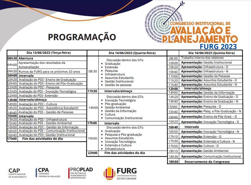 As inscrições para o evento estão abertas de 17 de maio a 13 de junho. Todos que desejam participar e contribuir para a elaboração do futuro da FURG são convidados a se inscrever.