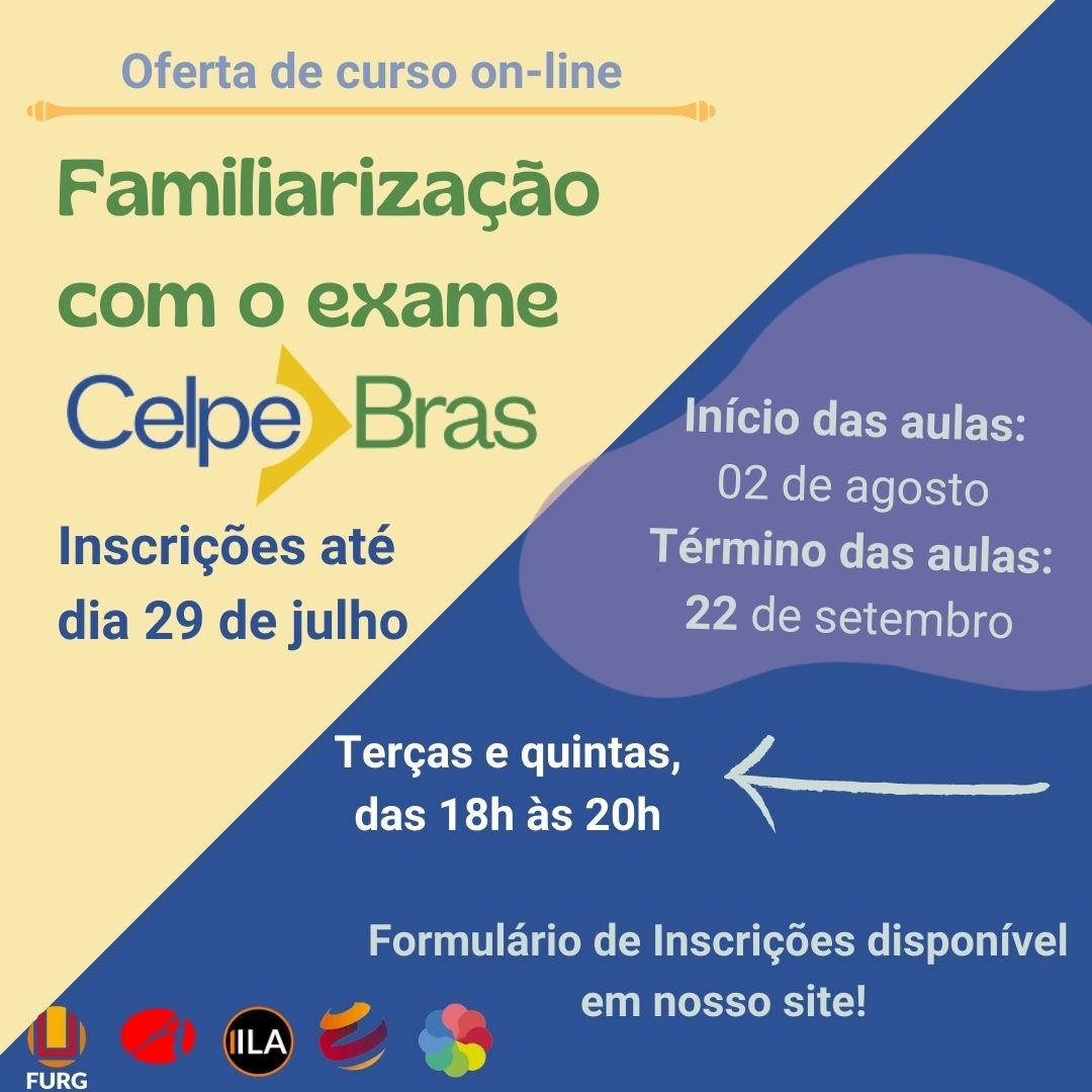 O Núcleo de Línguas (NucLI) da FURG promove curso para familiarização com o exame Celpe-Bras de 2 de agosto a 22 de setembro, nas terças e quintas, das 18h às 20h. As inscrições ocorrem por meio do preenchimento do formulário, disponível aqui, até 29 de julho.