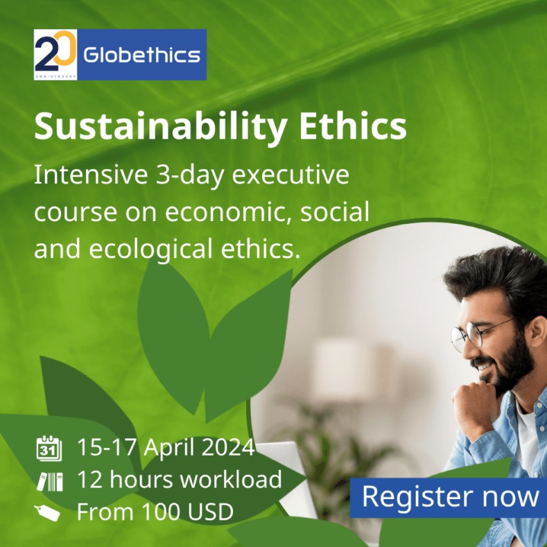 A Globethics, organização internacional dedicada à promoção da ética, está oferecendo o curso Sustainability Ethics ("Ética da Sustentabilidade"). O curso será realizado nos dias 15 e 22 de abril de 2024, em inglês e espanhol, respectivamente.