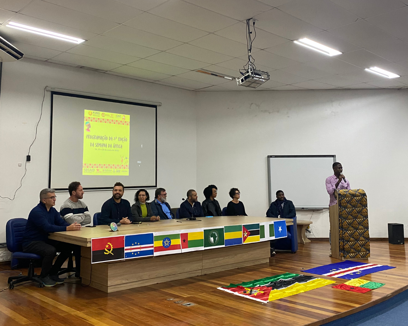 Na manhã de segunda-feira (26), deu-se início a Terceira Edição da Semana da África, evento organizado pelo Coletivo de Estudantes Africanos na FURG. O evento acontece nos dias 26, 27 e 28 de maio, com encontros no Campus Carreiros e no Campus Santa Vitória do Palmar. A abertura oficial, realizada no Auditório da SEAD, contou com a presença da secretária municipal da Cultura, do presidente da Câmara Municipal de Vereadores, de representantes da REINTER, SECOM, SECAID e de outras entidades apoiadoras da FURG.