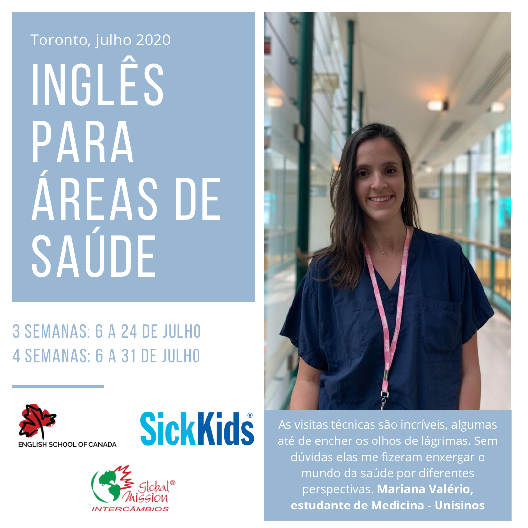 A 7ª edição do Programa Inglês Médico é realizada em Toronto, no Canadá, em parceria com a English School of Canada (ESC), e visa proporcionar três (3) semanas de curso e uma (1) de Observação Médica no Hospital SickKids – filiado à Universidade de Toronto- para estudantes e profissionais de Medicina, Enfermagem, Biomedicina, entre outras áreas da saúde.