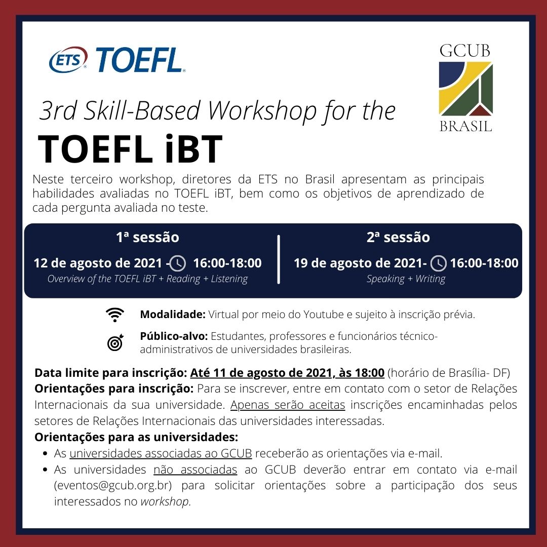 Em razão do sucesso alcançado, o Grupo de Cooperação Internacional de Universidades Brasileiras (GCUB), no âmbito do Acordo de Cooperação assinado com a Educational Testing Service (ETS), está lançando a terceira edição do workshop conhecido como “Skill-Based Workshop for the TOEFL iBT Test” para apresentar as principais habilidades avaliadas no teste de proficiência TOEFL iBT, bem como os objetivos de aprendizado de cada questão avaliada no exame. As inscrições estão abertas até 9 de agosto.