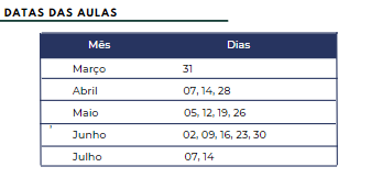 Datas e Horários das aulas: Quintas-feiras, de 19h30 às 21h30.